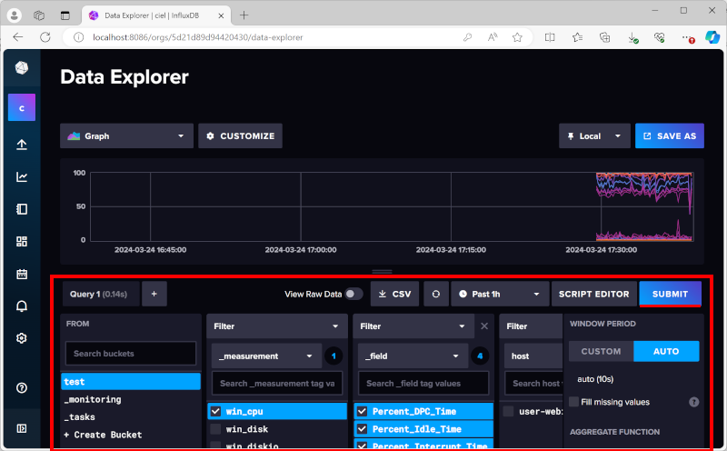 왼쪽부터 bucket(아래의 경우 "test")을 선택하고, measurement(아래의 경우 "win_cpu")를 선택하고, field(아랭의 경우 "Percent_DPC_Time", "Percent_Idle_Time", "Percent_Interrupt_Time", "Percent_Privileged_Time")를 선택하고 Submit 하면 선택한 그래프가 나타난다.