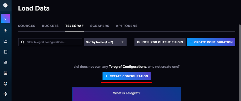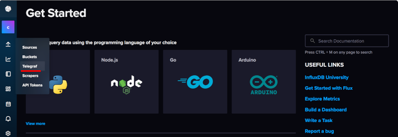 - InfluxDB화면 왼쪽 아이콘 메뉴에서 위 화살표 아이콘을 선택하면 나타나는 하위 메뉴 중 Telegraf를 선택한다.