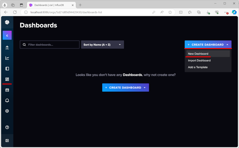 모니터링 대시보드를 만들기 위해 influxDB의 dashboards기능을 왼쪽 메뉴에서 선택하고 "Create dashboard"를 선택하고 "New Dashboard"를 선택해서 새로운 대시보드 만들기를 시작한다.