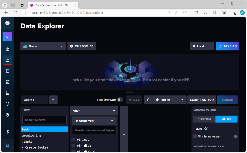 - InfluxDB화면 왼쪽 메뉴에서 두 번째 아이콘을 선택하면 Data Explorer화면으로 이동한다.