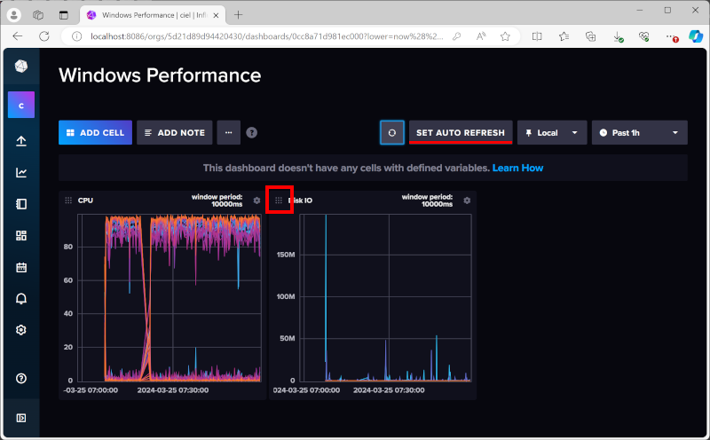 Cell을 하나 더 추가하면 기본적으로 밑으로 추가되는데, Cell의 왼쪽 위에 바둑판 모양의 아이콘을 마우스로 끌어서 원하는 위치로 옮기면 된다. 이제 "SET AUTO REFRESH"를 선택하고 화면의 그래프가 자동으로 업데이트되도록 하면 기본적인 대시보드가 완성된다.
