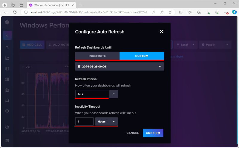 이렇게 만들어진 대시보드는 자동 화면이 변하지 않기 때문에 모니터링 화면처럼 데이터에 따라 그래프가 변화하게 하기 위해서는 "SET AUTO REFRESH"를 선택하고 모달 창에 몇 초마다 화면을 업데이트할 것인지를 "Refresh Interval"에서 설정하고 Confirm을 누르면 모니터링 화면처럼 그래프가 변한다.