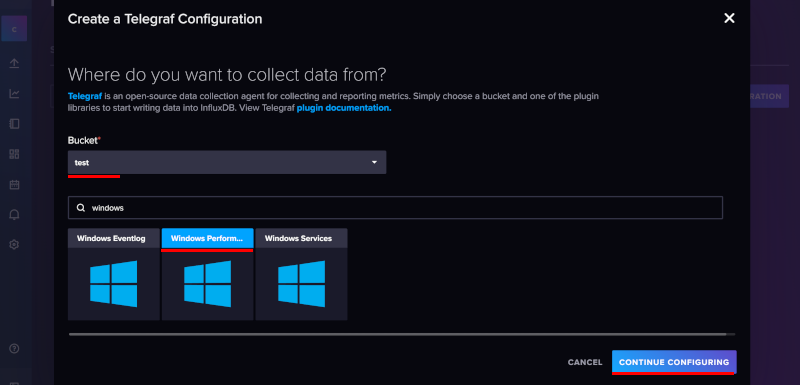 - Bucket을 선택하고 데이터를 수집할 대상, 즉 모니터링할 대상을 선택하고 "Continue Configuration"을 누른다.
