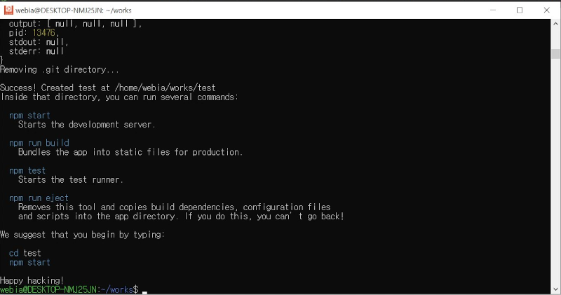 - 이제 create-react-app 명령으로 test프로젝트를 만든다.