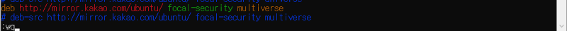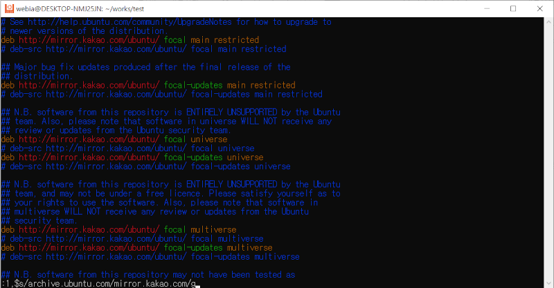 명령어 모드로 바뀌면서 커서가 화면 아래로 이동하면, 다음 명령을 입력하고 파일내의 archive.ubuntu.com를 모두 mirror.kakao.com으로 바꾼다. 이 vi명령은 1(첫번째 줄),$(마지막줄)s(ubstitue바꾼다)/archive.ubuntu.com을/mirror.kakao.com으로/g(모두)라는 뜻이다.