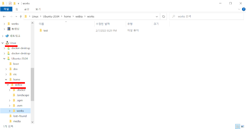 WSL을 활성화 시키고 우분투를 설치했기 때문에 윈도우 파일 탐색기를 열면 왼쪽 디렉토리 트리의 맨 밑, 네트워크 다음에 Linux가 보일 것이다. 이 폴더를 열면 우분투 OS의 파일을 볼 수 있는데 이 중 /home/[사용자명] 폴더를 열면 앞에서 만든 react프로젝트 폴더를 볼 수 있다. 이번 테스트에서는 /home/webia/works아래에 test라는 이름으로 생성했고 아래와 같이 확인할 수 있다.