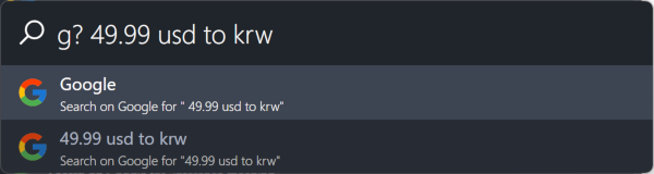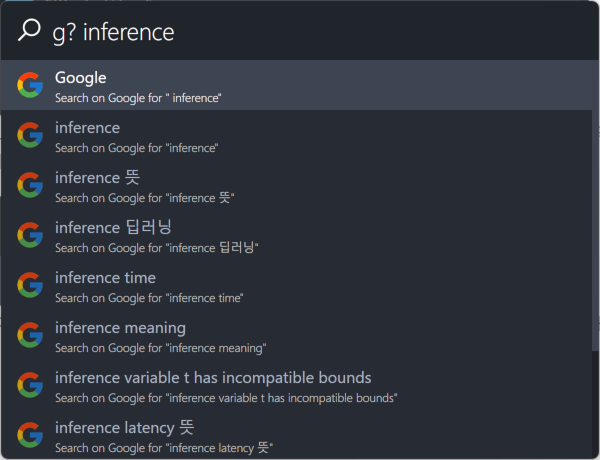 아직 기술문서를 많이 참고하는 입장으로써 구글을 자주 사용하는데 구글에서 검색을 하려면 g?로 시작하면 된다.