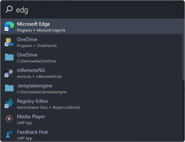 예를 들어 마이크로 소프트에서 제공하는 edge 브라우저를 실행하고 싶으면 내 경우 edg까지 입력하면 검색결과에 처음으로 나타난다. 이제 ENTER 키만 누르면 실행된다.