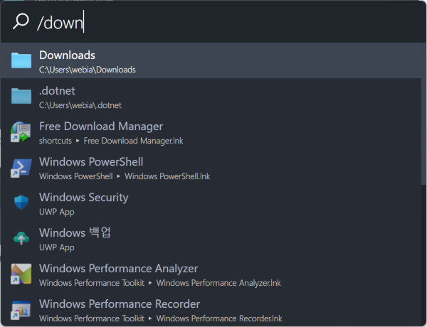 다운로드 폴더를 Windows 탐색기에서 열고 싶으면, /로 시작해서 찾고 싶은 위치를 넣으면 된다.