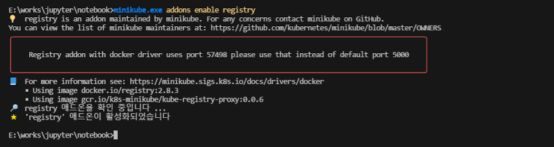 만일 사용하고 있는 쿠버네티스 클러스터가 minikube이면 제공되는 registry addon을 minikube명령으로 enable 하면 사용이 가능하다.