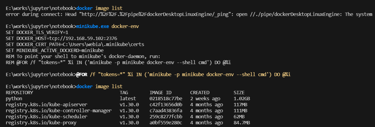 e. 윈도우 터미널에서 docker명령을 사용할 수 있게 아래 명령을 사용해서 minikube환경을 설정한다.