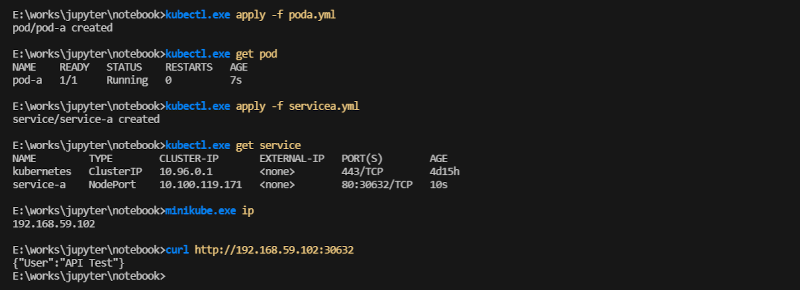 "<minikube ip>:<mapping port>" URL을 만들어 curl로 확인해 보았다.