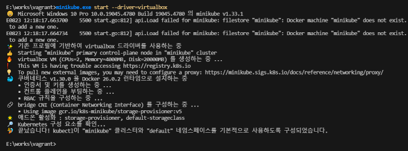 윈도우에서 minikube를 실행하면 docker를 이용하도록 기본설정이 되어 있다. 그래서 VirtualBox를 사용하게 하려면 minikube를 실행할 때 driver를 지정해 줘야 한다.