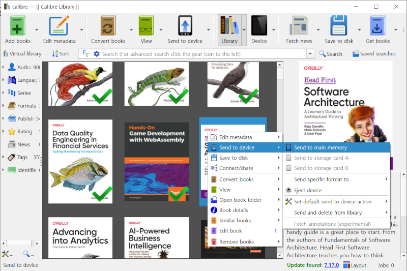이제 책을 선택하고, 오른쪽 마우스 버튼을 누르면 "Send to device"가 나오고 선택하면 하위 메뉴에 "Send to main memory"가 나오면 선택한다.