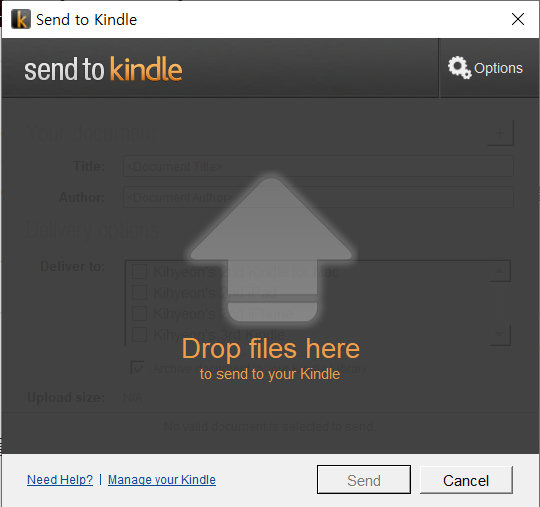 이전에는 PDF도 cover이미지를 올릴 수 있었는데 이제는 되지 않는다. 칼리버(Calibre)로 PDF를 킨들(Kindle)로 올리면 자동으로 변환이 되지 않기 때문에, 먼저 PDF를 아마존 파일포맷(AZW3)으로 변환한 다음 올려야 한다. 하지만, EPUB으로 된 책을 전송하면 칼리버(Calibre)가 자동으로 아마존 파일포맷(AZW3)으로 변환한 다음 킨들(Kindle)로 전송한다.
