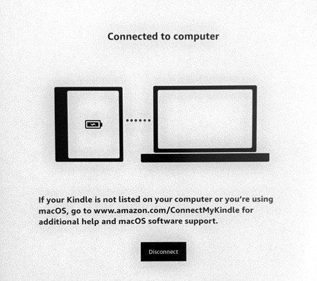 하면, 암호를 넣어 잠긴 상태를 풀면, 킨들(Kindle) 이북리더의 화면에 "Connected to computer"로 나타나고