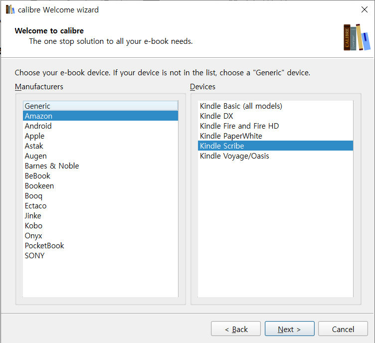 메뉴를 선택하고 나오는 위저드 화면에서 다른 부분은 변경 없이 "Next"를 선택하면 되는데 이북리더기를 선택하는 화면에서만 킨들 스크라이브(Amazon / Kindle Scribe)를 선택하면 된다.