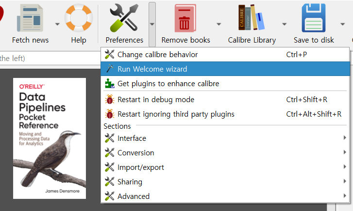 a. "Run Welcome Wizard"를 실행해서 이북리더기를 변경