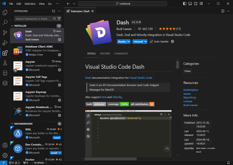 VSCode에서 Zeal을 사용하려면 Dash extension을 설치하면 사용할 수 있다.
