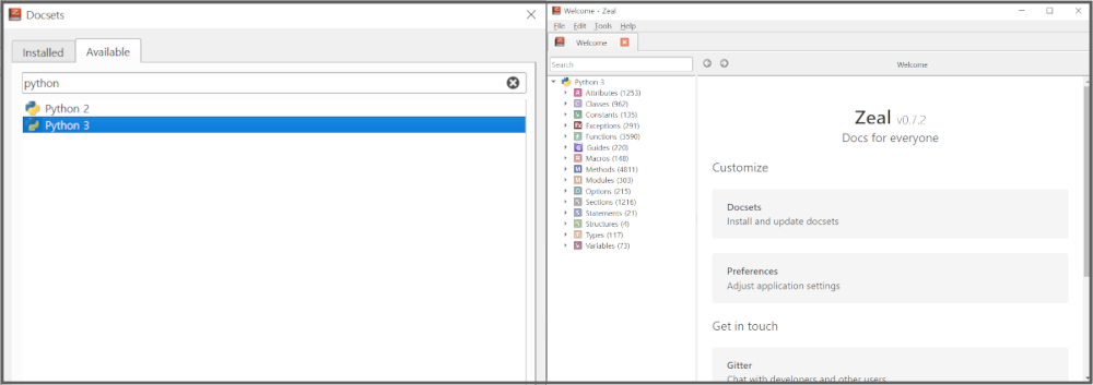 설치가 끝나면, Zeal을 실행한 다음 Docset을 선택하고 설치한다. Python 3의 예를 보면,