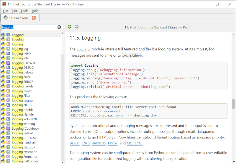 Docset을 받고 나면, 파이썬을 개발할 때 사용하는 함수의 도움말뿐 아니라 가이드 문서까지 모든 공홈의 문서를 Zeal에서 볼 수 있다. Elasticsearch의 프로그램 Logging 할 때 참고했던 "Logging Cookbook"도 파이썬 Docset을 설치하면 쉽게 찾아볼 수 있다.