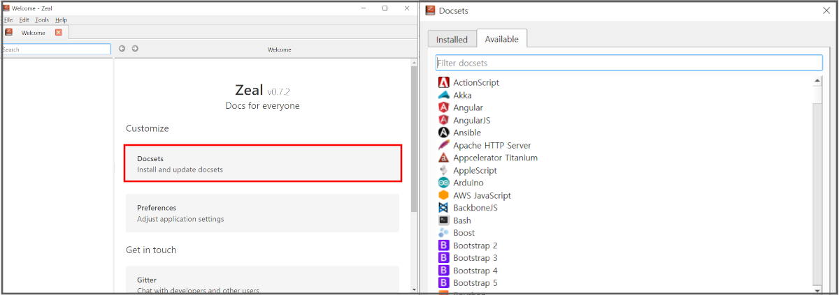 Dash와 유사하고, Dash에서 제공하는 도움말 / 참고문서인 Docset을 수정 없이 사용할 수 있는 윈도우용 프로그램이다.