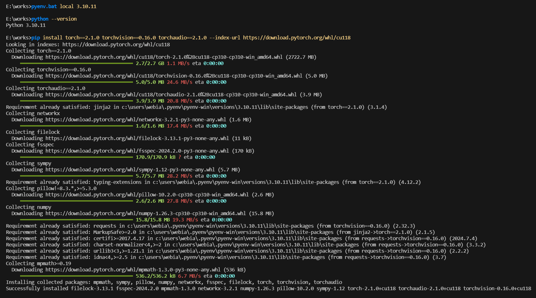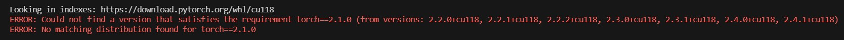 pip install torch==2.1.0 torchvision==0.16.0 torchaudio==2.1.0 --index-url https://download.pytorch.org/whl/cu118