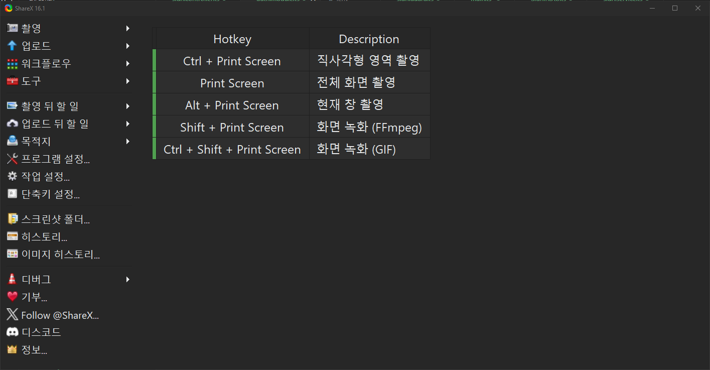 ShareX을 시작하면 아래와 같이 "촬영", "업로드", "워크플로우", "도구", "촬영 뒤 할 일", "업로드 뒤 할 일", "목적지", "프로그램 설정", "작업 설정", "단축키 설정" 등의 주요 메뉴를 보여준다. 정말 기능이 많아 보인다.