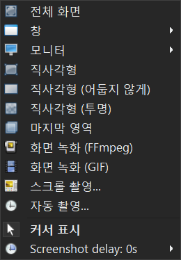 스크린샷을 목적으로 했다면 "촬영"메뉴와 "촬영 뒤 할 일"메뉴에 주목해야 한다. 촬영 메뉴를 선택하면 아래와 같이 전체 화면을 선택하거나, "창" 메뉴를 선택하고 현재 실행되고 있는 프로그램의 창을 선택하거나, 모니터를 선택하고 사용하고 있는 모니터를 선택해서 스크린샷을 캡처하거나, 직사각형을 선택하고 영역을 선택하여 화면 캡처를 할 수도 있고, 화면을 사각형으로 선택하고 화면 녹화를 하고 GIF로 만들 수도 있다. 하지만 작업하기 전에 "촬영 뒤 할 일"을 꼭 선택해야 한다.