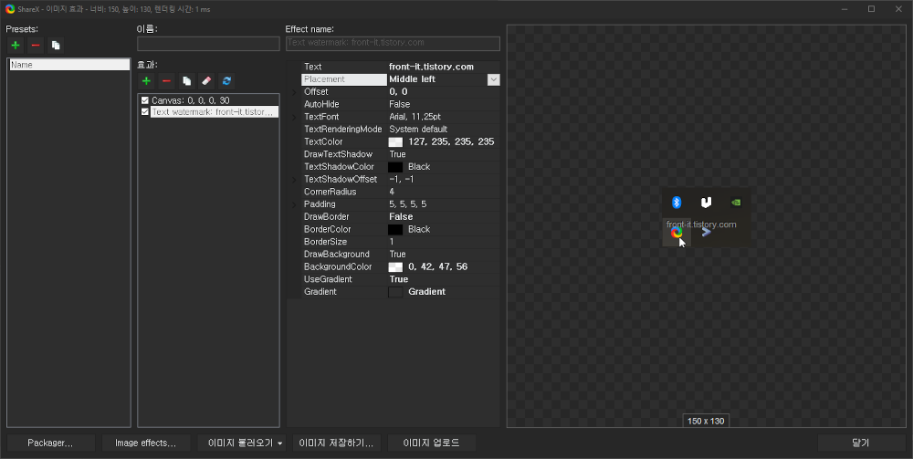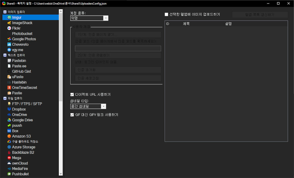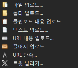 업로드는 "목적지"메뉴에서 선택한 목적지로 이미지, 파일을 업로드하는 기능이다. 테스트 삼아 설정하지 않은 채로 업로드를 눌러봤더니 바로 기본으로 설정되어 있는 imgur.com으로 업로드되어 버렸다.