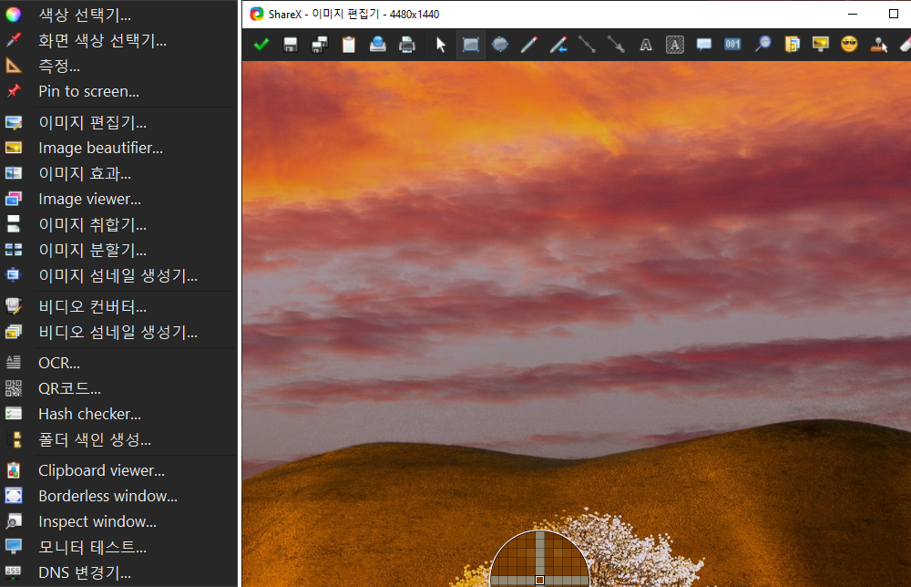 많은 기능들이 "도구"하위메뉴에 있다. 색상을 선택해서 값을 찾을 수 있는 "색상 선택기"도구도 있고, 화면에 궁금한 색상에 대한 값을 얻을 수 있는 "화면 색상 선택기"도구도 있고, 화면 창이나 컴포넌트등의 크기를 측정할 때 사용할 수 있는 "측정"도구도 있고, 간단하게 이미지를 편집할 수 있는 "이미지 편집기"도구도 있고, 이미지의 섬네일을 만드는 기능 ffmpeg를 이용해서 형식을 바꿀 수 있는 "비디오 컨버터"도구, 이미지의 텍스트 영역을 선택하면 글자로 변환해 주는 "OCR"도구, QR코드를 만드는 도구 등 다양한 도구들이 있다.