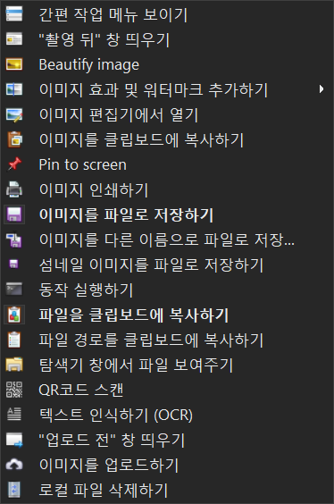 "촬영 뒤 할 일"을 선택하면 아래와 같이 선택할 수 있는 작업목록이 나오는데 하나도 선택하지 않으면 화면 캡처를 해도 아무런 일이 일어나지 않는다. 나는 아래와 같이 "이미지를 파일로 저장하기"를 선택해 두었기 때문에 "스크린샷 폴더"에 파일이 생성되는 것을 확인할 수 있었다.