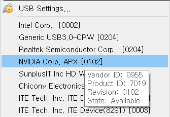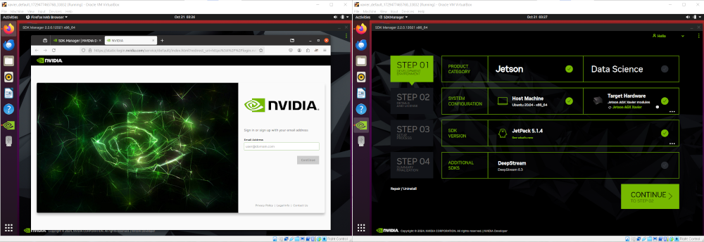 왼쪽 화면은 Jetson Xavier에 리눅스가 이미 설치된 경우에 나타나며, 초기 상태에서 설치를 진행하려면 Jetson을 Recovery모드로 전환한 후 연결하면 오른쪽 화면이 표시된다. 우분투 데스크탑이 Virtualbox에서 실행되고 있기 때문에 Jetson Xavier를 Recovery모드로 만들고 나면 Virtualbox의 USB Settings를 열고 "NVIDIA Corp. APX"를 연결해야만 우분투 데스크탑에서 인식한다.