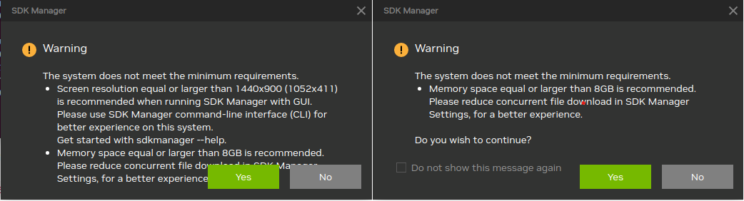 설치가 완료되면 SDK Manager를 실행한다. SDK Manager는 우분투 가상머신의 메모리가 8G 이하이거나 화면의 해상도가 1440 X 900보다 낮으면 실행할 수 없다는 메시지를 보인다.