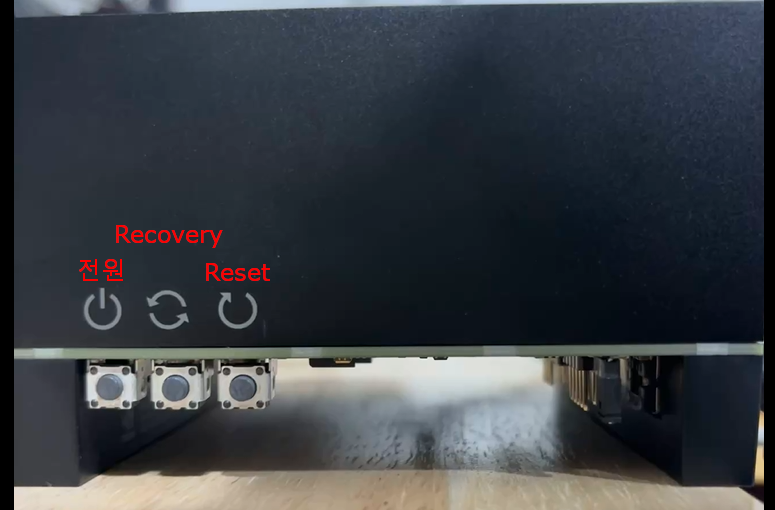 Jetson을 Recovery모드로 만들려면 중간 (Recovery) 버튼을 누른 다음, 전원버튼을 누르고 잠시 기다렸다가 동시에 놓으면 Recovery모드로 들어간다. 이때 컴퓨터로 연결하는 USB케이블은 반드시 전원이 있는 쪽이 아닌 앞쪽 USB 포트에 연결해야만 인식이 된다.