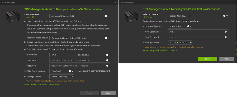 Step 1을 지나고 Step 2에서 다운로드가 끝나면 Jetson Xavier의 메모리를 Flash 하기 위해 2가지 옵션을 선택할 수 있다.