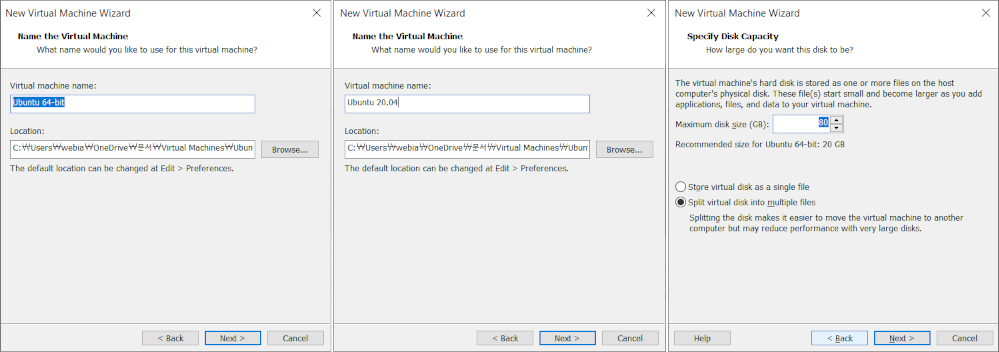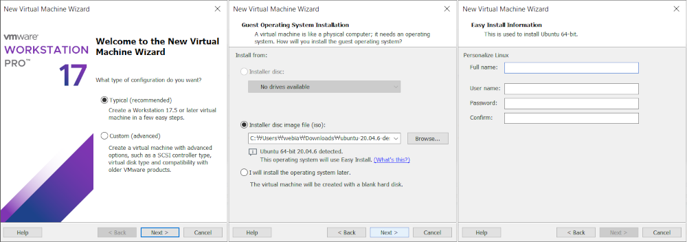 VMware에는 Vagrant를 사용할 수 없기 때문에, File 메뉴에서 New Virtuial Machine을 선택하거나, Ctrl + N 키를 눌러 가상머신을 만드는 위저드를 실행한다. 처음 Workstation을 실행했을 때에는 화면 중앙에도 가상머신을 만드는 버튼이 보인다. 위저드의 처음 두 단계는 기본설정으로 두고 "Next >"를 선택했고, 세 번째 화면에서 가상머신에서 사용할 계정정보를 입력했다.