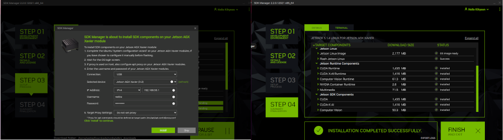 앞에서 진행한 "2. JetPack 설치"에서 "b. SDK Manager로 JetPack 설치" 절차를 다시 진행하면, 이번에는 리눅스를 Flash 하는 과정이 문제없이 진행되고 나머지 SDK가 잘 설치되는 것을 확인할 수 있었다.