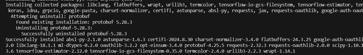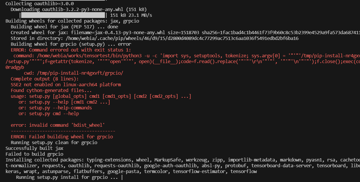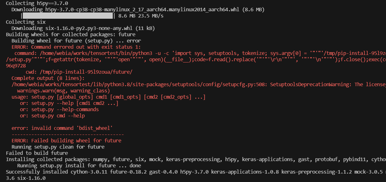 Tensorflow를 설치한다. 문제가 발생한 것처럼 보이지만 그 아래 메시지에 따르면 future는 정상적으로 설치되었다. 이제 Tensorflow 2.12를 설치한다.