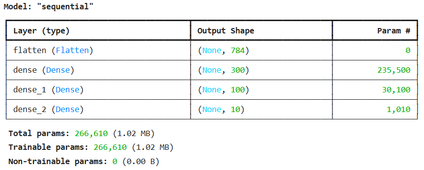 학습에 사용할 모델은 아래와 같이 Dense (Fully connected) 층만을 사용하는 모델로 266,610개의 파라미터를 학습시켜야 한다는 것을 의미한다.