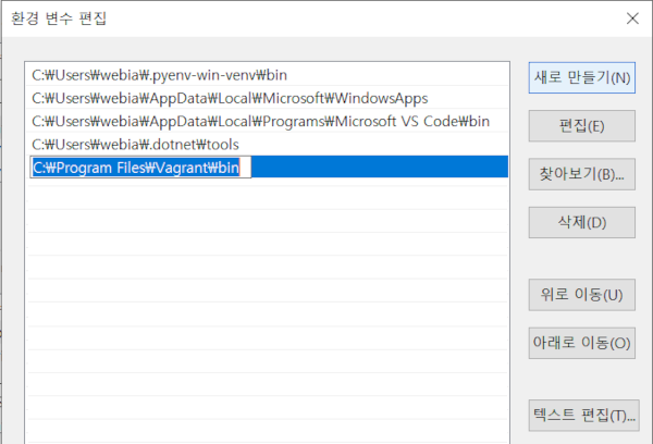 Vagrant는 PATH환경변수에 내가 설치한 실행파일의 위치(C:\Program Files\Vagrant\bin)가 등록되지 않기 때문에, Win+R을 눌러 나오는 입력창에 "sysdm.cpl"을 넣어 실행하면 나오는 "시스템 속성"창에서 "고급"을 선택하고 아래의 "환경변수(N).."을 선택한 다음 PATH에 추가하면 된다.