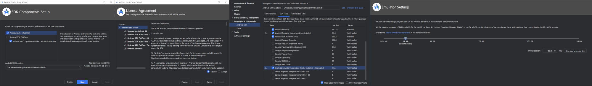 먼저 1, 2 화면에서와 같이 SDK를 선택해서 설치하고 나면 안드로이드 스튜디오의 메인화면이 나타나는데, 다시 "SDK Manager"를 선택하고, 아래와 같이 두 번째 탭인 "SDK Tools"를 선택하고 "Android Emulator hypervisor driver (installer)"와 "Intel x86 Emulator Accelerator (HAXM installer) - Deprecated"를 선택해서 설치하면 위의 화면과 같이 진행된다.