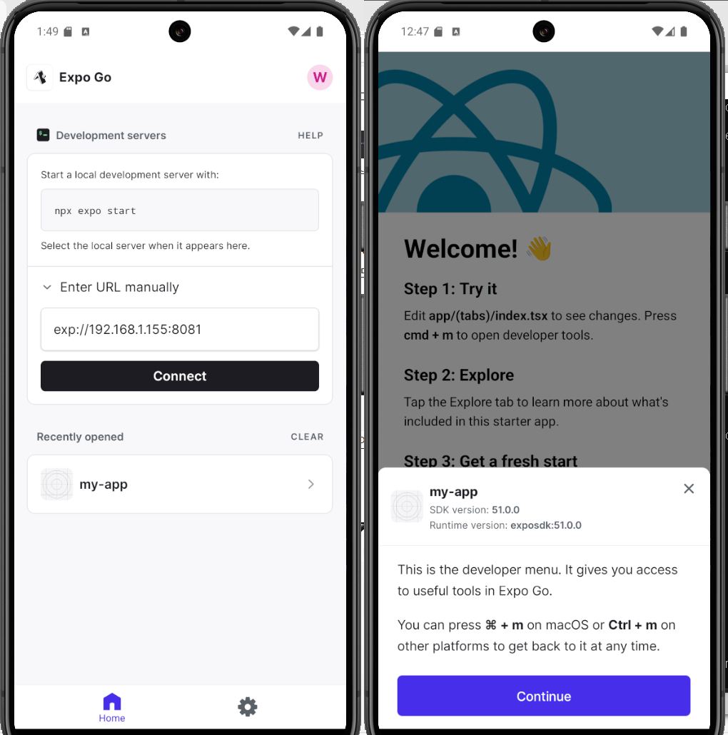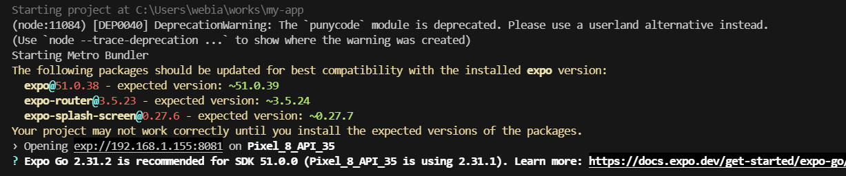 프로젝트 이름을 넣고 프로젝트를 생성하면 React Native 앱을 안드로이드 가상머신에 있는 Expo go에서 실행할 수 있다.