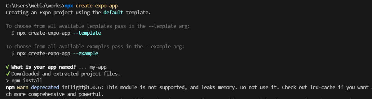 다음으로 expo 프로젝트를 생성한다. 예전에 사용하던 expo-cli는 이제 사용할 수 없기 때문에 create-expo-app을 사용하여 프로젝트를 만든다.