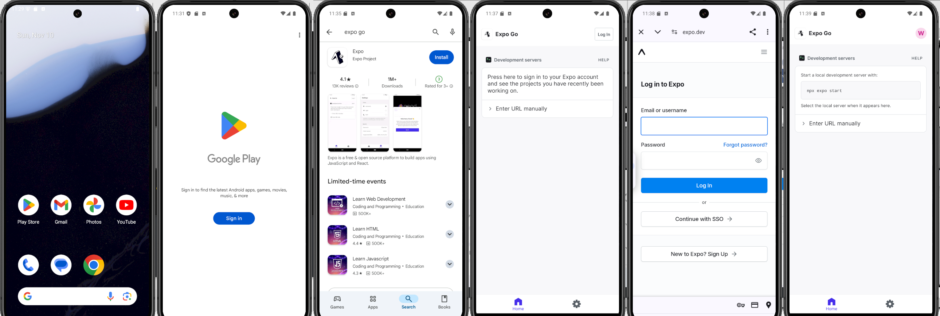 안드로이드 가상머신이 실행되면 "Google Play Store"로 로그인해서 "Expo go"를 설치하고 로그인한다. 아직 가입하지 않았으면 "Signup"을 선택하고 Expo에 가입한다. 한 달에 50개 앱까지는 무료로 사용할 수 있다. Expo를 사용하지 않고 개발해도 되지만 처음 시작할 때는 Expo를 사용하는 것이 개발속도가 빠르기 때문에 Expo로 개발하고 나중에 Expo를 분리하는 것이 더 효율적인 것 같다.