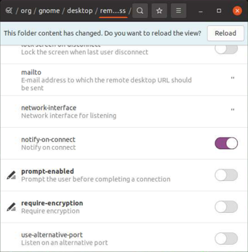 또, 일반적으로 사용하는 VNC client들이 remote access가 암호화되어 있는 경우 접속이 안 되는 경우가 많기 때문에, dconf editor를 설치하고