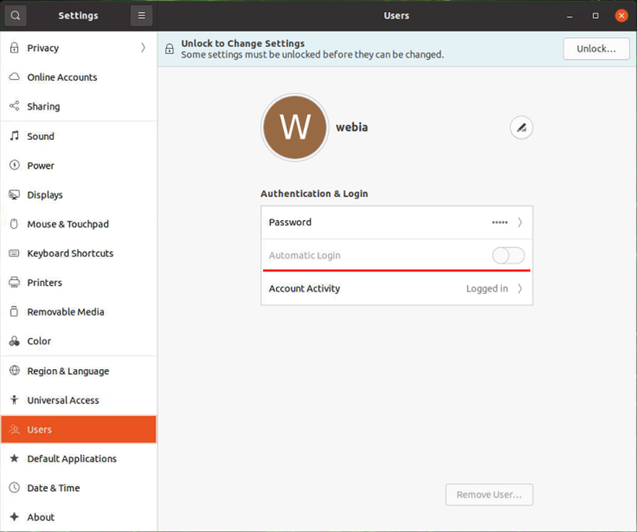 하지만, 이렇게 접근하기 위해서는, 아이러니하게도 데스크탑을 로그인해 두어야 한다. 그래서, 패스워드 없이 바로 로그인하도록 Settings \ Users에 Automatic Login을 Enable 해 놓으면 컴퓨터를 커고 모니터와 키보드를 연결하지 않아도 우분투 데스크탑에 연결할 수 있다.