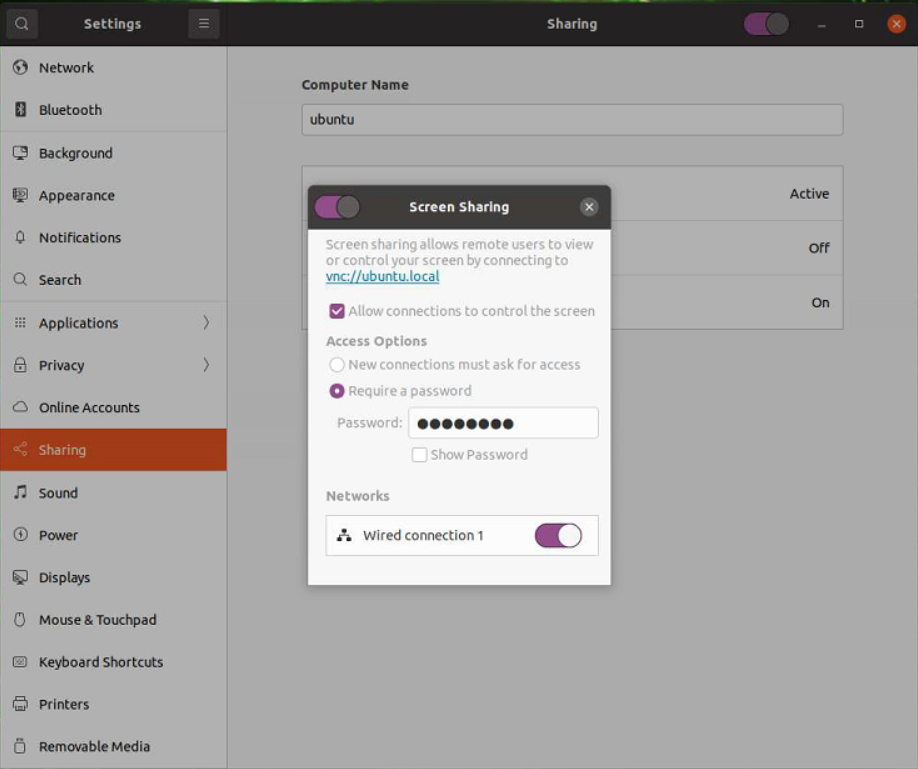 Vino서버를 사용해서 원격에서 접속하려면, 먼저 Xavier에 모니터와 키보드를 연결해서 우분투에 로그인을 한 다음, Setting \ sharing에서 Screen Sharing을 On으로 허용해 주어야 한다.